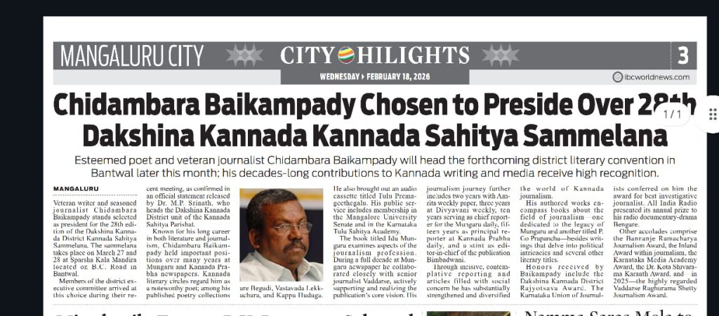 The appointment of Chidambara Baikampady as President of the 28th Dakshina Kannada Kannada Sahitya Sammelana is a tribute to a life that has consistently upheld the power of language the responsibility of journalism and the cultural soul of Karnataka.
