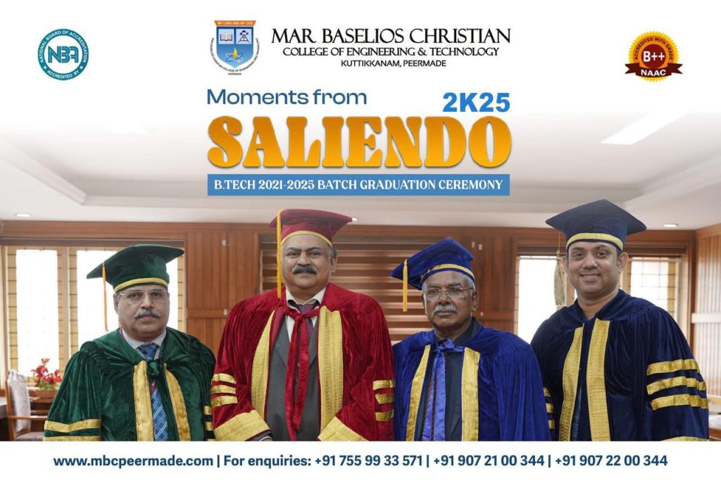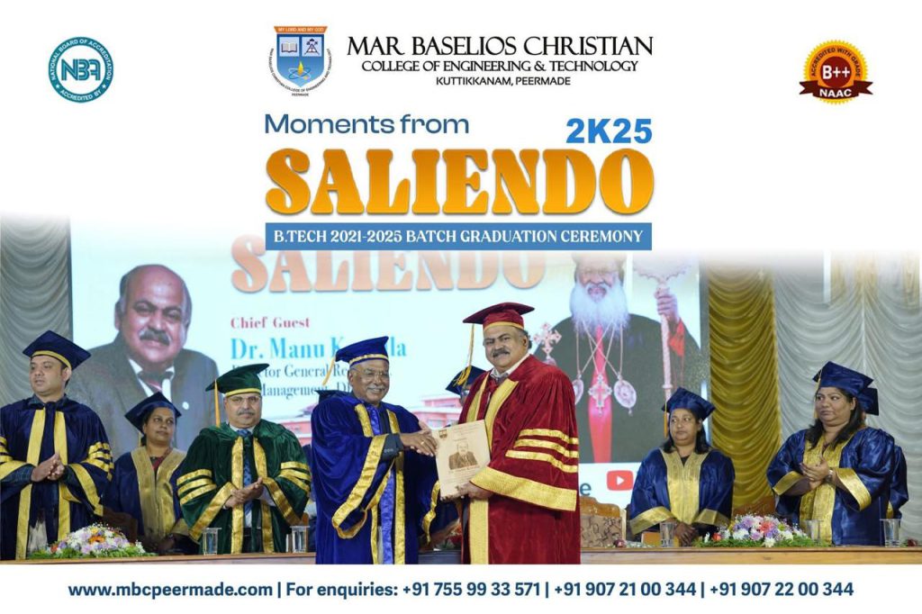 Mar Baselios Christian College of Engineering & Technology (MBCET), Kuttikkanam, came alive with pride and excitement during its convocation ceremony Saliendo 2K25. The air buzzed with hope as students, parents, faculty, and well‑wishers gathered to celebrate the graduates of 2025.