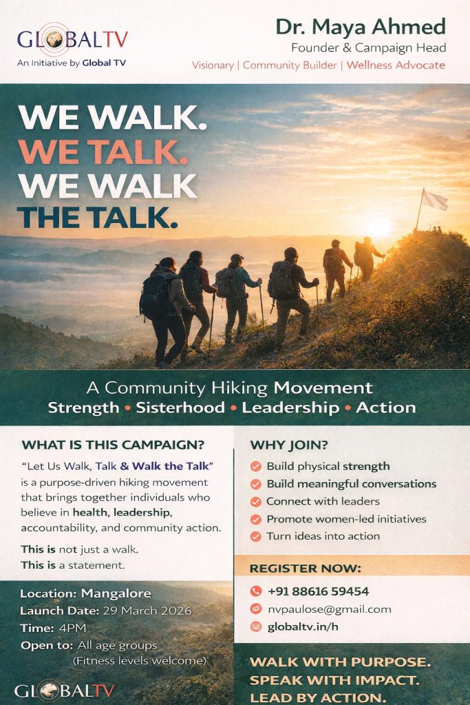 Some movements begin with noise. Others begin with intention. “Let Us Walk, Talk and Walk the Talk” begins with both purpose and action. This upcoming community initiative by Global TV, led by Dr. Maya Ahmed, invites people to step away from passive conversations and step into meaningful motion. The campaign will officially launch in Mangalore on 29 March 2026 at 4 PM, bringing together individuals who believe that change must be lived, not just discussed.