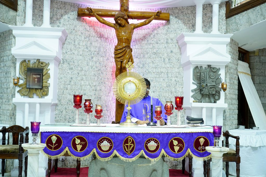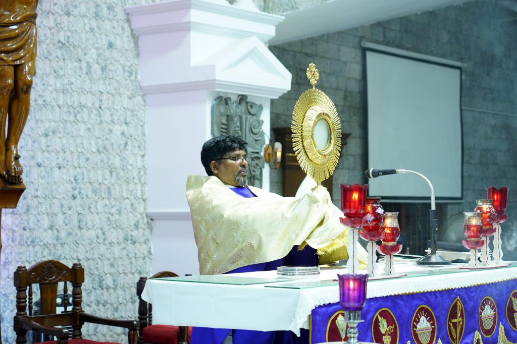 Following the Holy Mass, Eucharistic Adoration was held in an atmosphere of deep silence and prayerful reflection. Special prayers were offered for students preparing for examinations, for parents who support them with dedication and sacrifice, and for teachers who guide and shape young minds. This time of adoration allowed the faithful to pause, reflect, and entrust their concerns and aspirations to God.