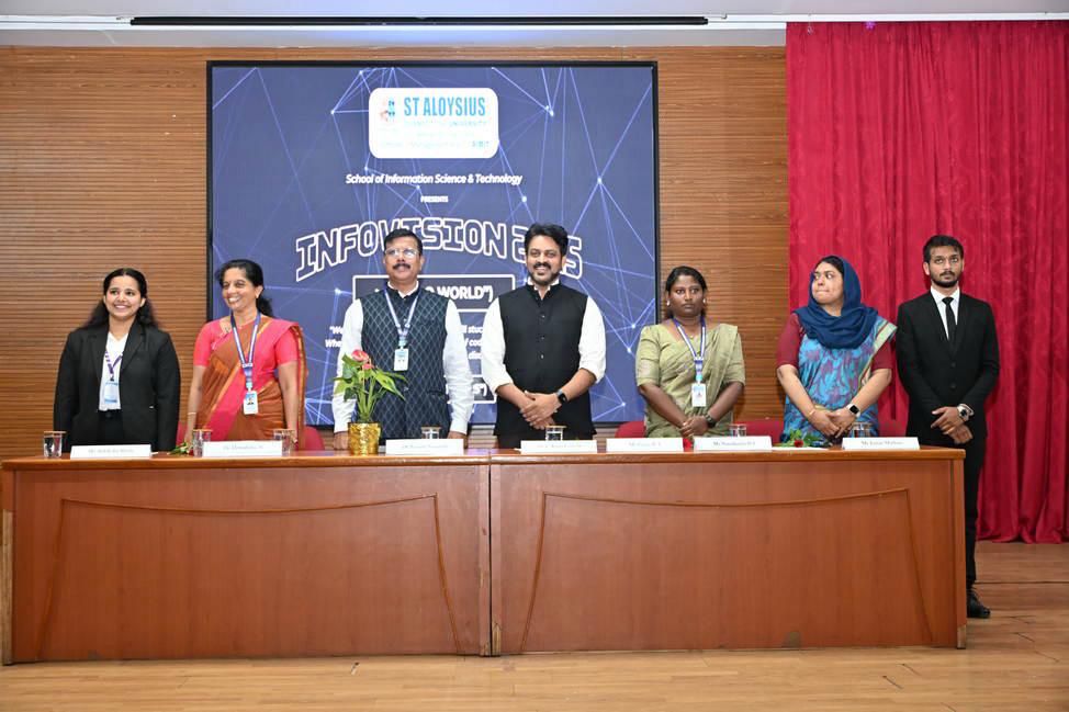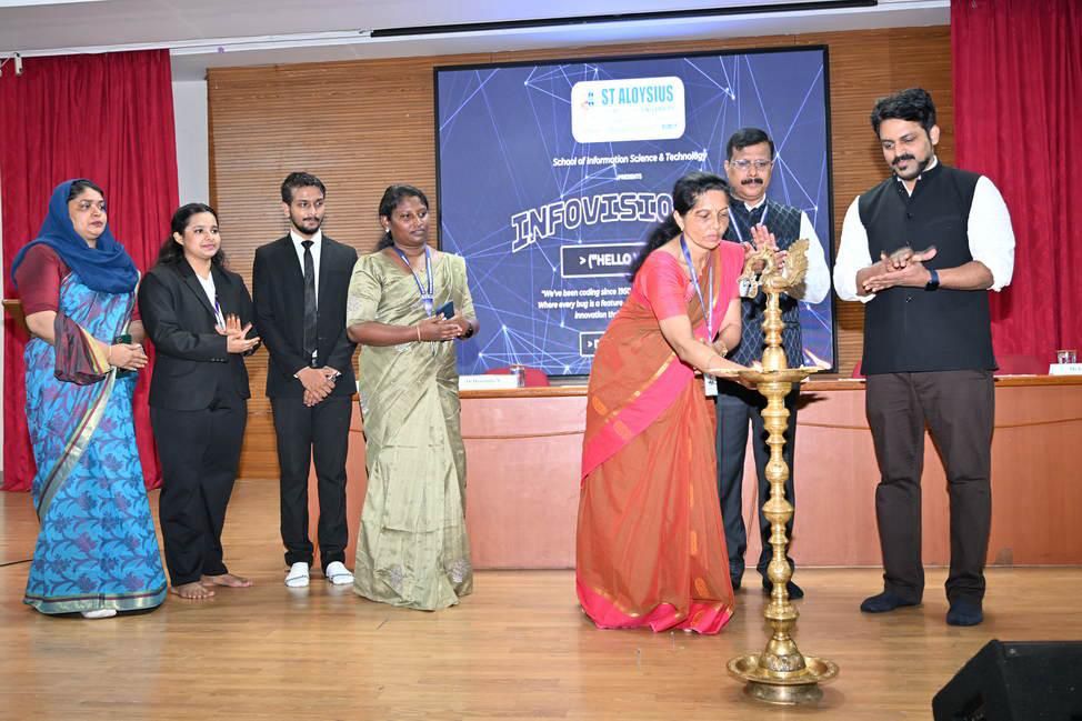 On May 9, 2025, the PG Department of the School of Information Science & Technology at St Aloysius (Deemed to be University), AIMIT Centre, successfully organized its annual intercollegiate tech fest, INFOVISION 2025, under the creative theme “HELLO WORLD”, with the witty tagline: “We’ve been coding since 1950… and still stuck at ‘Hello World’.” The fest served as a vibrant platform for undergraduate students to exhibit their analytical, technical, and cultural talents.