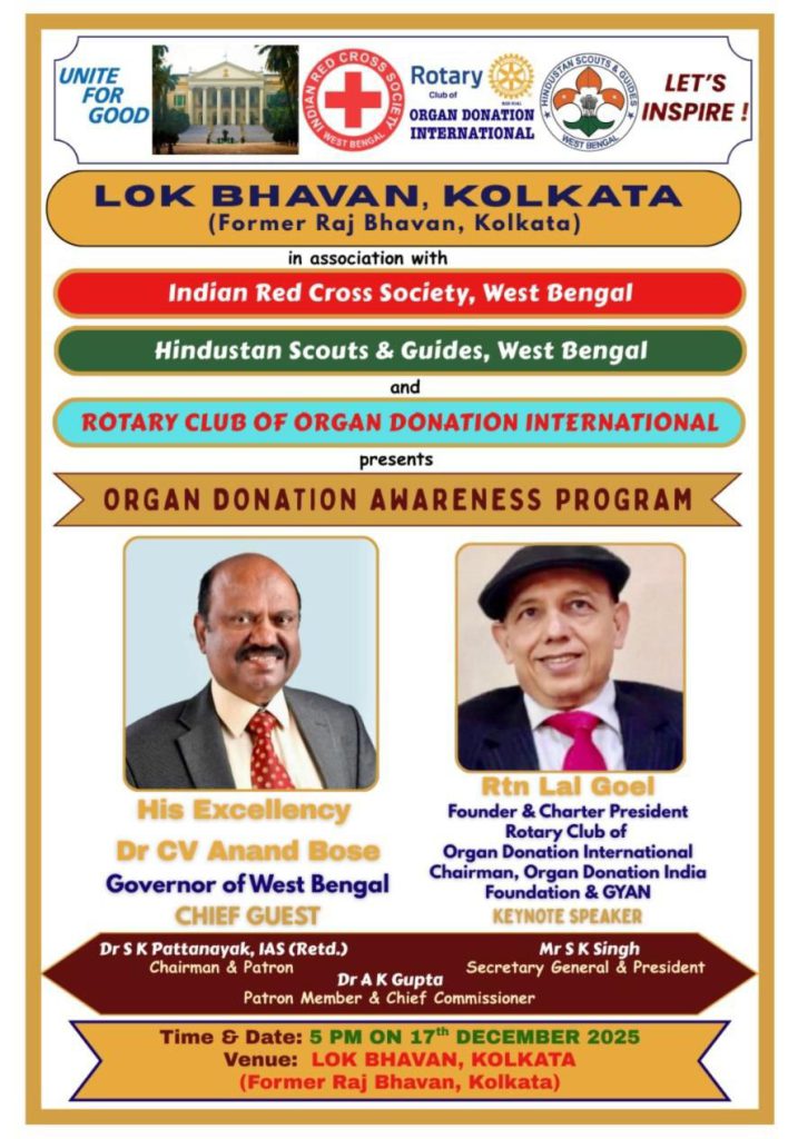 Kolkata, December 2025: In a significant step to address the critical gap between organ availability and need, the hallowed halls of LOK BHAVAN, Kolkata (the former Raj Bhavan), will resonate with a mission of life and generosity on December 17, 2025. The Rotary Club of Organ Donation International, in a pioneering collaboration, is organizing a high-level Organ Donation Awareness Program to galvanize public action and policy support.
