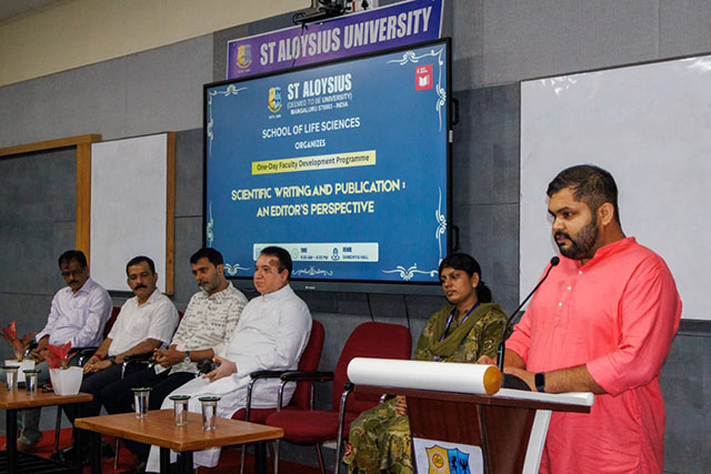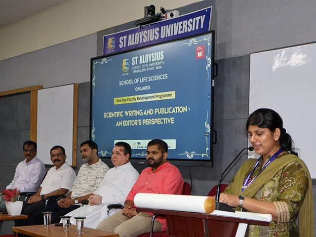 Mangaluru, Oct 18: The School of Life Sciences at St. Aloysius (Deemed to be) University successfully organized a one-day Faculty Development Programme (FDP) on ‘Scientific Writing and Publication: An Editor’s Perspective’ on October 17 at the Sanidhya Hall. The event provided crucial insights to faculty and researchers on navigating the complex world of high-impact academic publishing.