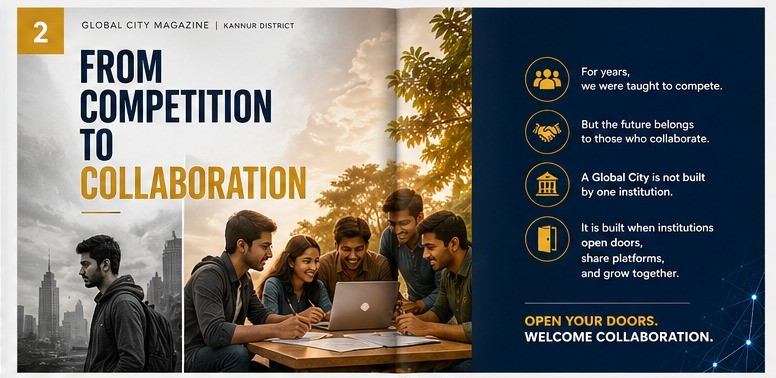 Competition divides. Collaboration multiplies. In many districts, institutions compete for prestige, funding, or attention. But Global City Kannur proposes a shift, to share resources, cocreate content, and celebrate collective wins. When colleges stop rivalries and start combines, everyone benefits. A studio at one campus can serve many. A story from one student can inspire thousands. This shift is not naive. It is strategic. Collaboration reduces duplication, builds trust, and accelerates impact. From local to global, Kannur can lead by example. Moving from competition to collaboration turns scarcity into abundance and rivals into partners.