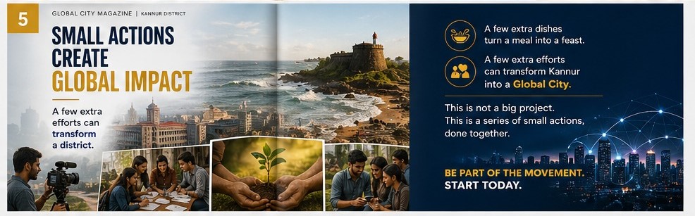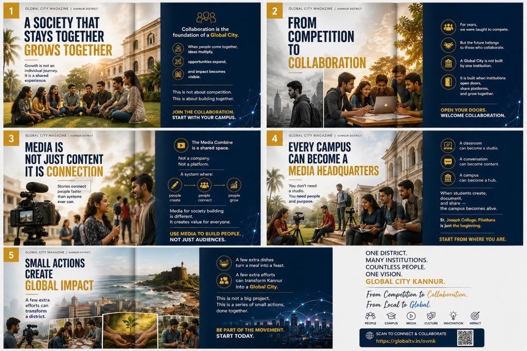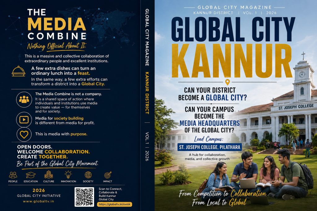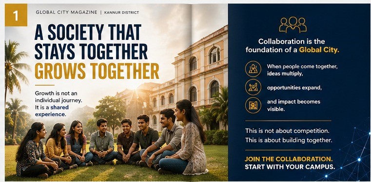 Global City Kannur is not a government scheme, a private company, or a waiting room. It is a movement. A massive, collective collaboration where ordinary people and extraordinary institutions turn small actions into global impact. We believe a few extra efforts can transform a district. A classroom becomes a studio. A conversation becomes content. A campus becomes a media headquarters. This is media with purpose, not for profit, but for people. From competition to collaboration. From local to global. From many institutions to one vision.