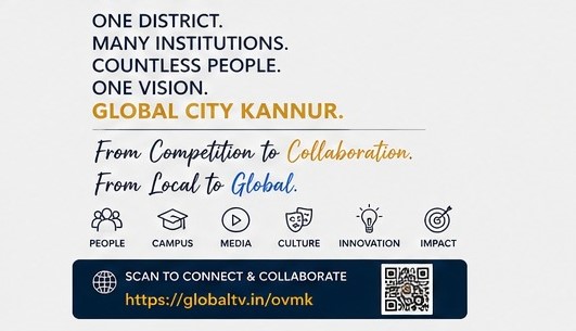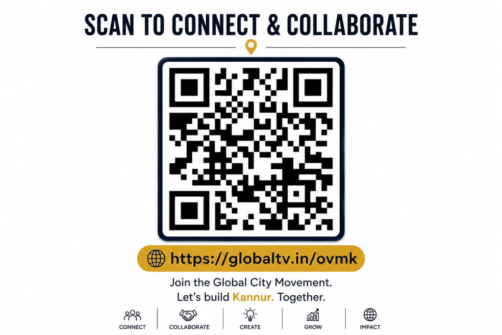 Waiting for perfect resources or permission means never starting. The movement is already alive. Scan the QR code, visit https://globaltv.in/ovmk, and connect. Starting today means filming a three-minute interview, sharing a story, a campus event, or inviting another college to collaborate. No red tape. No budget required. Every participant builds momentum. The Global City Kannur vision grows one story, one connection, one small action at a time. Do not wait for a leader. Become one. Scan, join, create, and share. The district is ready. The world is watching. Your campus, your voice, your moment is now.