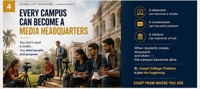 You do not need a professional studio to be a media hub. You need people with purpose and the will to share stories. A smartphone, a classroom, and a few motivated students are enough to start. When a campus becomes a media headquarters, learning becomes visible, local issues gain attention, and students gain real world skills. Recording events, interviewing alumni, or documenting community work turns ordinary moments into powerful content. In Kannur, every college, big or small, can produce, publish, and connect. Media headquarters are not built with money. They are built with intention and collaboration.