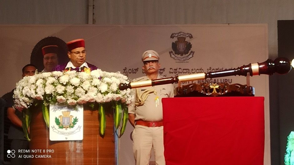 Bengaluru, September 27: St. Joseph’s University held its second annual convocation ceremony on Saturday, beginning at 10:00 a.m. with a procession of rank holders and special awardees, followed by the ceremonial march of dignitaries. The event was presided over by the Honourable Governor of Karnataka, Shri Thaawar Chand Gehlot, in the presence of the Honourable Minister for Higher Education, Dr M.C. Sudhakar, and Chief Guest Dr Jarugu Narasimha Moorthy, Director, Indian Institute of Science Education and Research (IISER), Thiruvananthapuram. Rev. Fr. Dionysius Vaz, SJ (Chancellor), and Rev. Dr Victor Lobo, SJ (Vice-Chancellor), were also present.