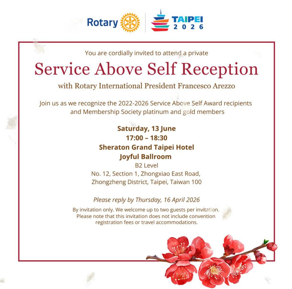 “Dear Lal, Thank you for your dedication to service through Rotary, and congratulations on receiving the Service Above Self Award or reaching the platinum or gold level in the Membership Society for New Member Sponsors. To honour your achievements, we invite you to gather with other 2022–26 Service Above Self Award recipients and Membership Society platinum and gold members at a special reception at the Rotary International Convention in Taipei.”