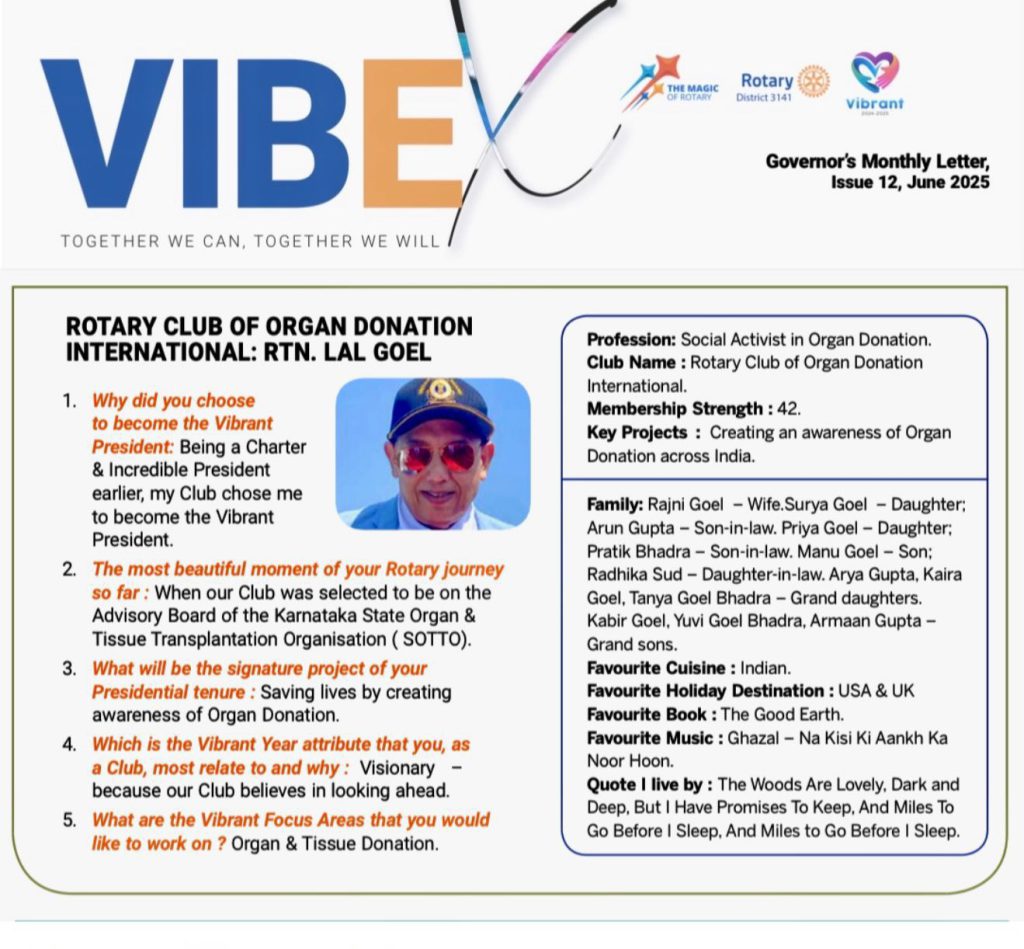 Mumbai, June 1st, 2025– Rotarian Lal Goel, Charter & Vibrant President of the Rotary Club of Organ Donation International, expressed heartfelt gratitude to District Governor Chetan Desai for featuring his profile in the Governor’s Monthly Letter (VIBEX GML) for June 2025.
