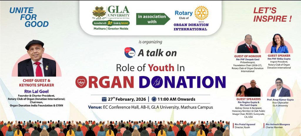 Mathura, February 27 — Delivering a powerful and inspiring address at GLA University, Rotarian Lal Goel, Founder and Charter President of the Rotary Club of Organ Donation International and Chairman of the Organ Donation India Foundation & GYAN, called upon the youth of India to emerge as “Brand Ambassadors of Organ Donation.”